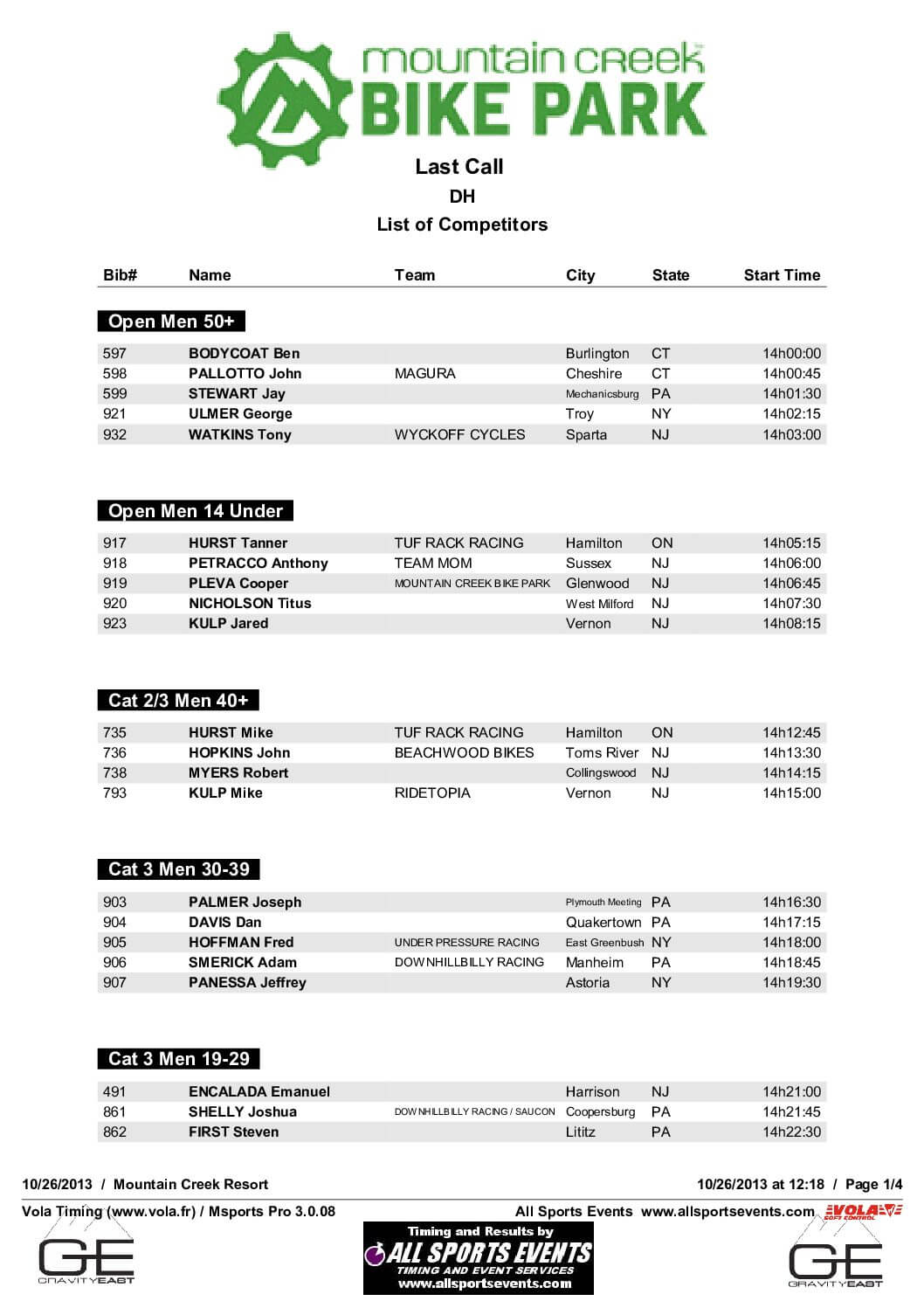 Gravity East Series Mountain Creek Vernon, NJ June 8, 2014 DuryeaResultsbyClass2014.pdf Download Results » DuryeaOverallResults2014.pdf Download Results » MountainCreek_StartList.pdf Download Results » MountainCreekResultsbyClass2014.pdf Download Results » MountainCreekOverallResults2014.pdf Download Results »
